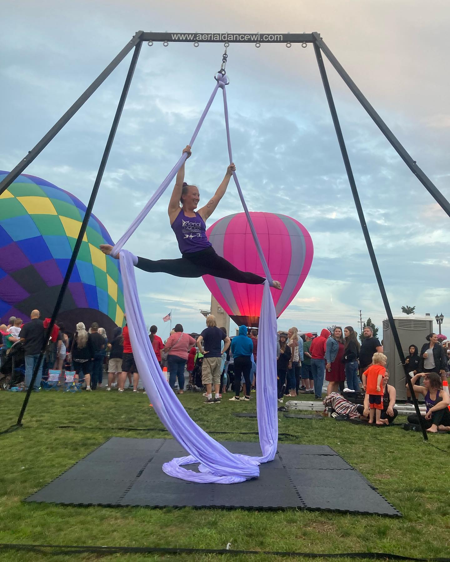 When we are contacted for performances, we extend the invitation to our current members. We ask that performers wear black leggings and an Aerial Dance top, or Aerial Dance colors whenever possible. Performers then join us on site and rotate in taking turns on the rig doing longer combo's and sequences on the apparatus.