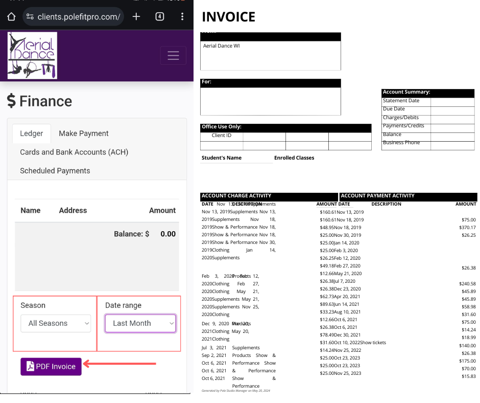 Under Finance, click on the button "PDF Invoice" to download a PDF of all charges. You can filter the charges that will be shown on the PDF by filtering to a specific pole term under "Season" or you can choose to filter within the last month or last year under "Date Range."