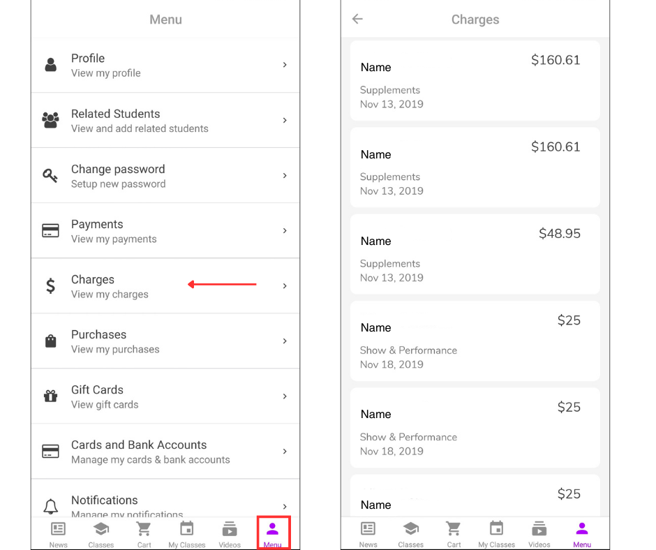 On the app, click on the "Menu" at the bottom of your app. In the menu, click on charges to view the history of the charges.